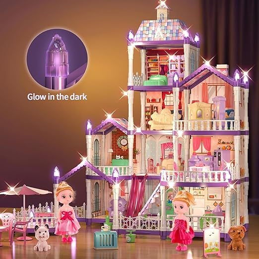 - 【Dreamy Features】The Andtooy upgraded doll houses for girls 3-5 glow in the dark and does not require batteries, simply expose the constructed dollhouse to bright light for 15 minutes, then turn off the lights or place the purple building toys for girls in a dark place to reveal a fairytale glowing princess castle.