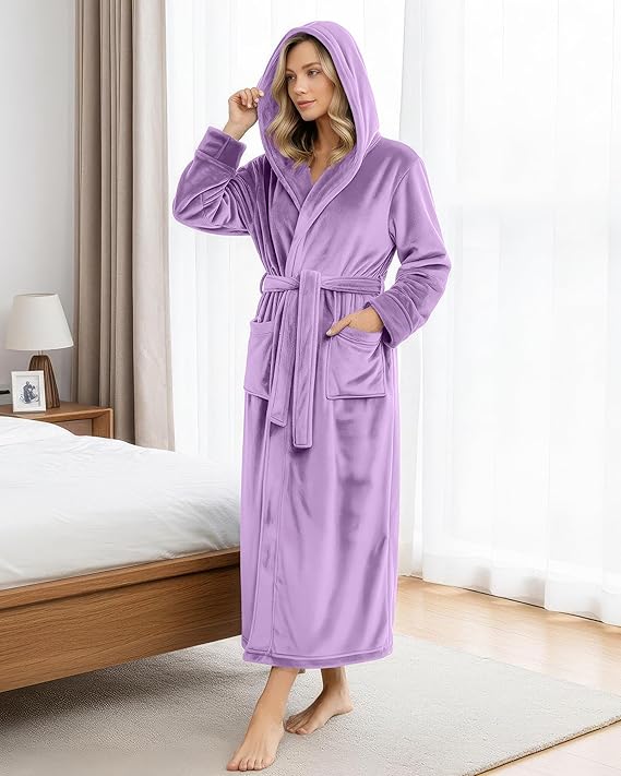 - HOODED FLEECE ROBE - Super soft, plush fleece hooded bathrobe made of flannel fleece offers great comfort when you wear it; perfect for lounging, relaxing and a great choice to wear after a tiring day at work.
